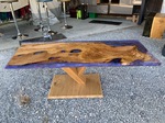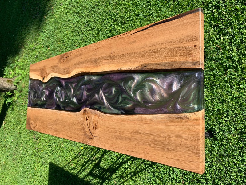 Mehrere neue massive Couchtische in Olivenholz und Eiche mit farbigem Epoxy aufgefüllt.