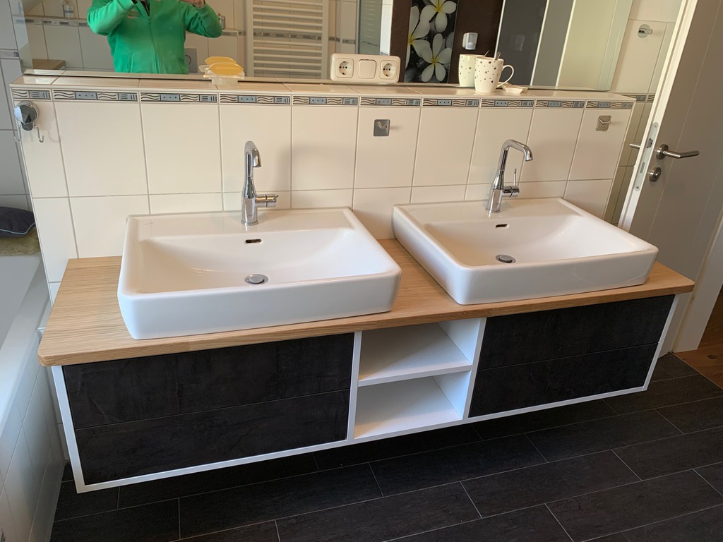 Küchenumbau und Ergänzungen, komplette Küchen mit Massivholz, Badumbau oder schnelle Badrenovierungen mit HPL Rückwandplatten, Büroeinbauten und Epoxy-Besprechungstische,
