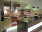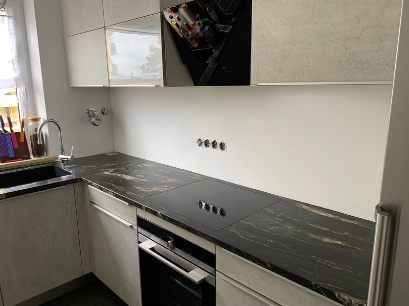 - In die Jahre gekommene Küchenzeile wurde komplett erneuert und durch Hochschränke, einige neue Unterschränke sowie einige Sonderlösungen komplett neu aufgebaut. Ergebnis ist wesentlich mehr Stauraum, pflegeleichte neue Oberflächen und eine moderne helle LED Beleuchtung mit Stimmungslicht.