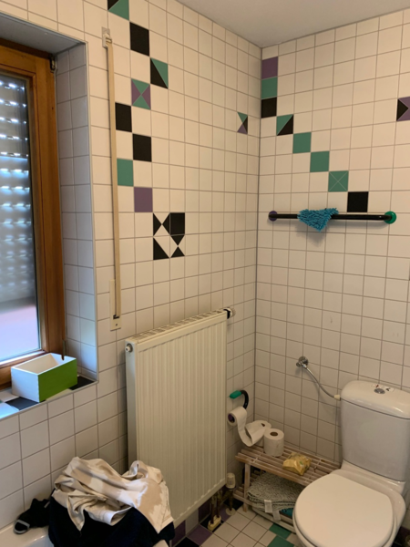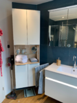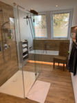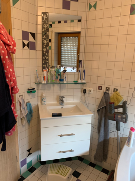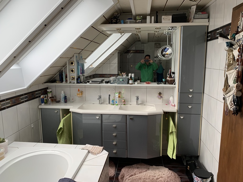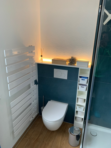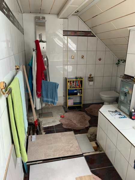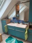 - Kompletter Badumbau mit Raumtrennung und neuer Anordnung der Dusche und zusätzliche Dachflächenfenster für größere und hellere Optik. Der neue Raum hinter dem Badezimmer wurde als Büro komplett neu gestaltet. Im Badezimmer neue Wandverkleidungen mit Rückwandpanelen in Betonoptik, neue Feinsteinbeläge in Holzoptik und moderne LED Beleuchtung.