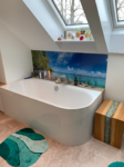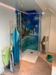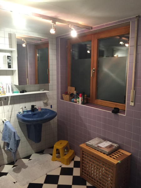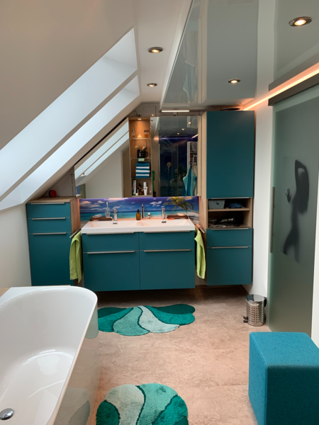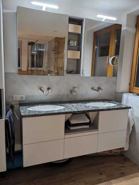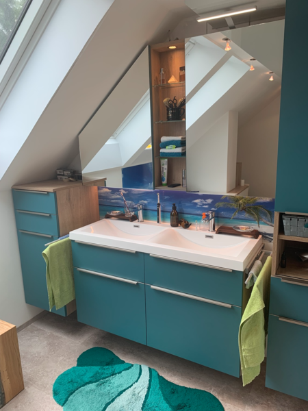 - Altes Familienbad komplett erneuert. Boden und Fliesen raus. Spanndecke und Korkboden rein. Neue Waschtischmöbel in Sonderanfertigung und komplette Wandverkleidung mit Fotodruck HPL Platten, auch im Duschbereich!