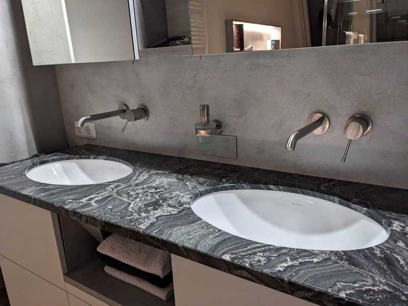 Helle und funktionale Badmöbel mit einer Waschtischplatte aus Naturstein Paradiso Silver und eingelassenen Keramik Becken von Villeroy&Boch.