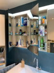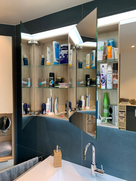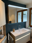 - Kinderbad Umbau mit Großformat Steinfliesen, Nolte SPA Waschtischmöbel und Spiegelschrank mit beidseitigem Spiegel und LED-Beleuchtung oben und im Griffprofil sowie seitlich im offenen Hängeschrank Abteil. Die LED Beleuchtung kann hier per Fernbdienung im Weiß Farbton und der Helligkeit variiert werden.